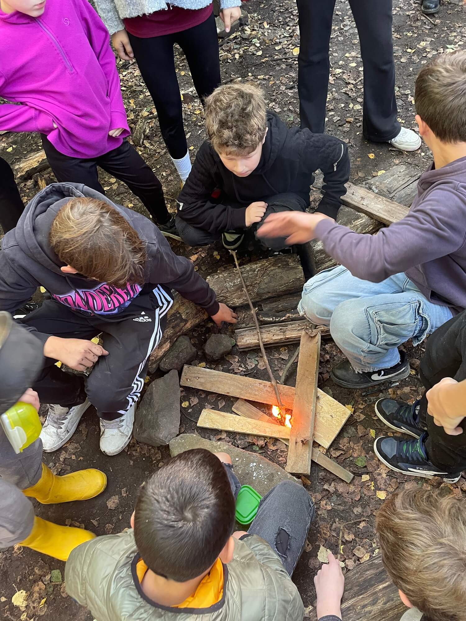 Schüler machen ein Lagerfeuer.