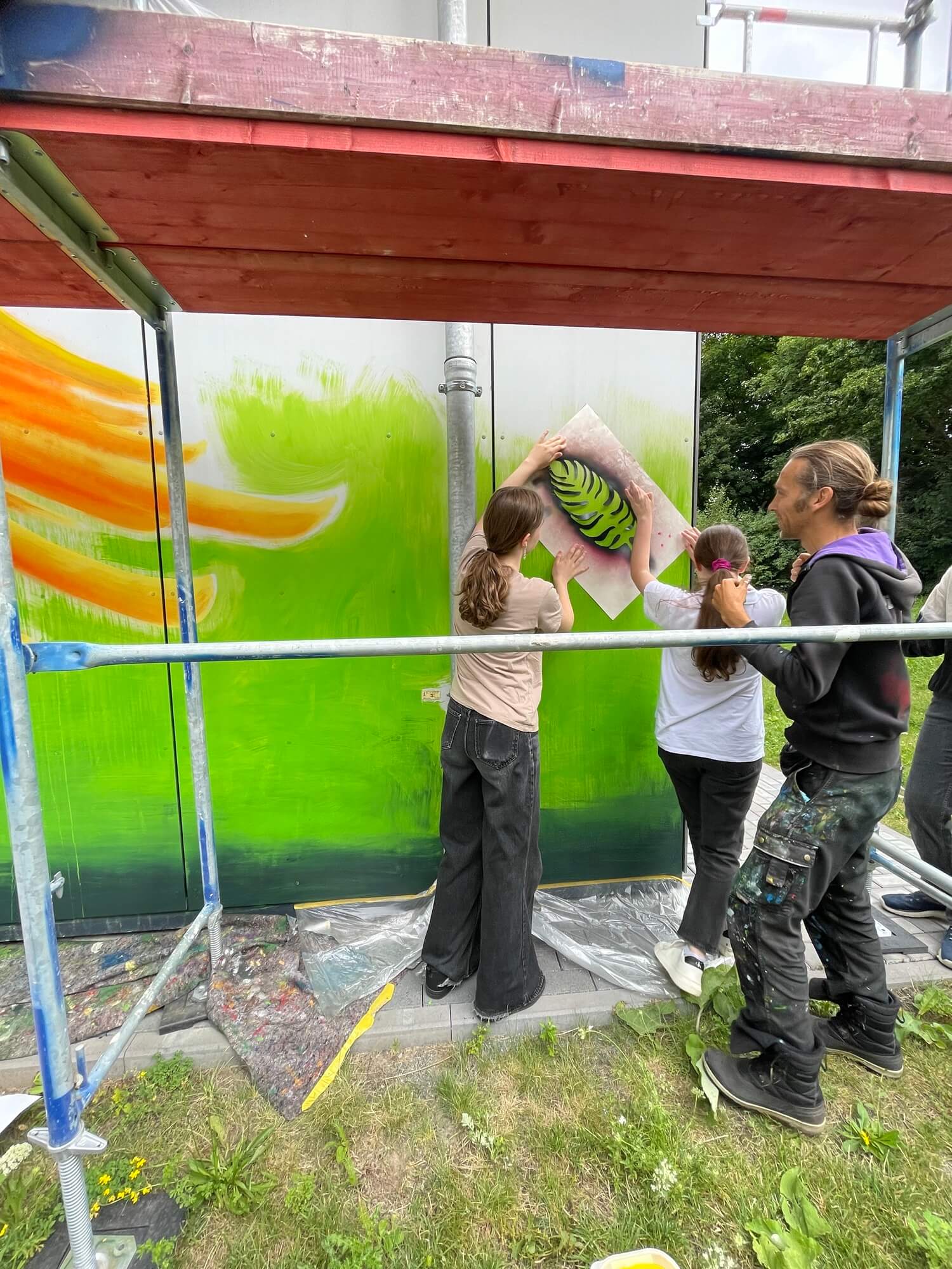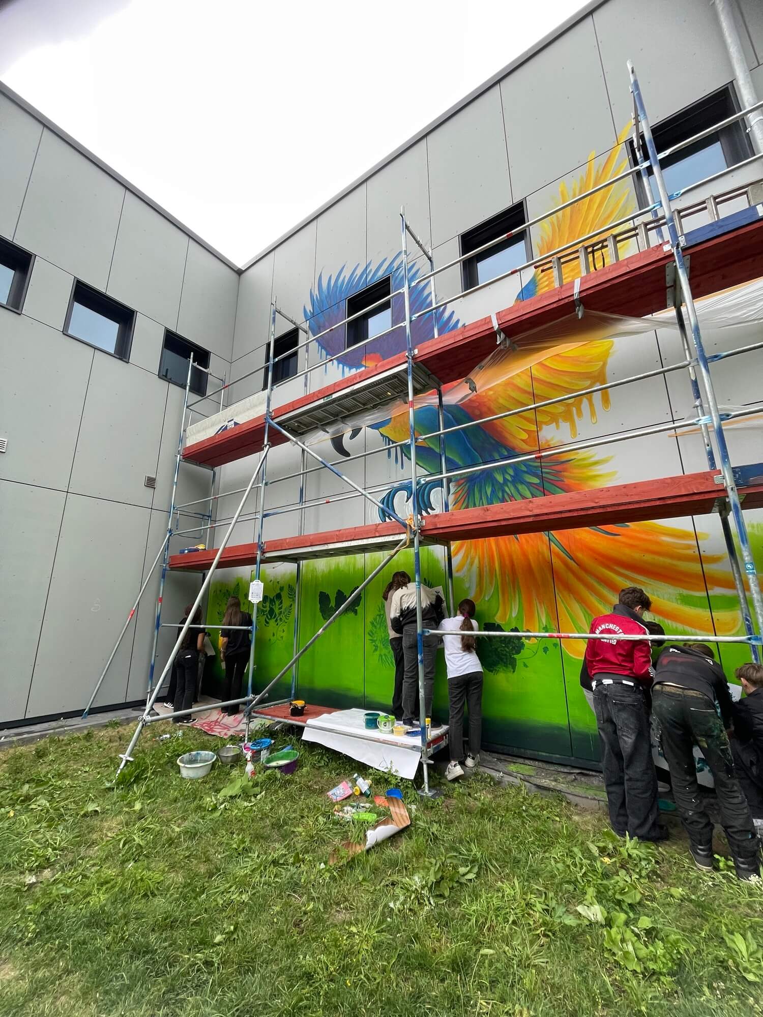 Der Einsatz der Schülerinnen und Schüler hat sich gelohnt: Dank der erlaufenen Spenden und der Unterstützung des Fördervereins, dem an dieser Stelle nochmals herzlich gedankt wird, konnten in der Projektwoche zahlreiche kreative und nachhaltige Projekte umgesetzt werden. So wurde unter anderem ein Gewächshaus gebaut, der Schulgarten verschönert, ein mobiler Barfußpfad gestaltet und ein Upcycling-Projekt durchgeführt. Hier wurden „Art Pieces“ aus alten Boards hergerichtet. Außerdem entstand ein großes Street-Art-Bild eines bunten Papageis, das nun die Schule schmückt – ein schönes Symbol für die Vielfalt unserer Schülerschaft. Weitere Gruppen stellten Marmelade her, verschönerten den Schulhof oder unternahmen lehrreiche Ausflüge.